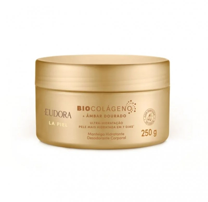 A Manteiga Hidratante Desodorante Corporal La Piel Âmbar Dourado tem 10% de Manteiga de Karité, ingrediente altamente hidratante, e a combinação do Biocolágeno, Niacinamida e Pantenol, aumenta a produção de colágeno natural, proporcionando firmeza em 14 dias.