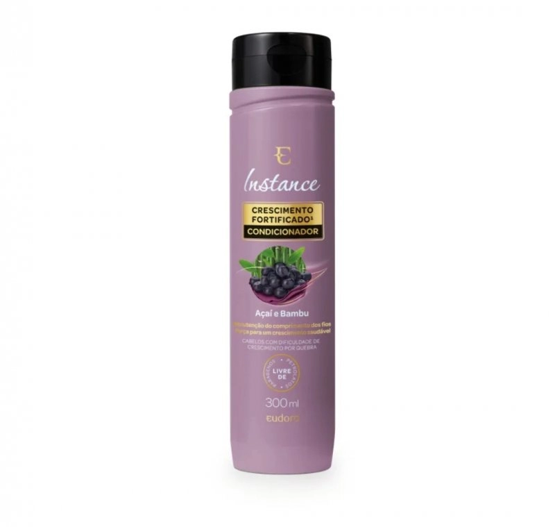 O Condicionador Instance Açaí e Bambu age na manutenção do comprimento dos fios, garantindo cabelos macios e com muito brilho.