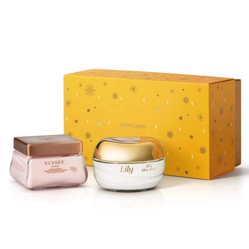 O Kit Presente Acetinados vai encantar a todos. Pela primeira vez, os dois cremes acetinados que são sucesso em O Boticário, Lily e Elysée, estão juntos em um só kit, formando um presente criativo de arrasar. Nada melhor que presentear com amor, para ficar gravado na memória, no coração e na pele: