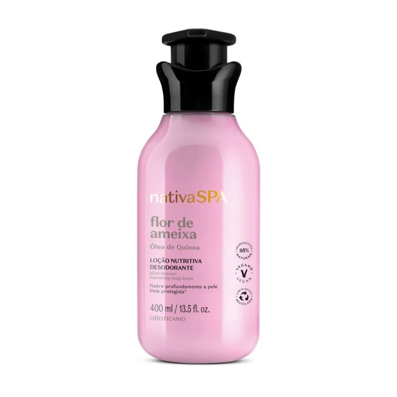 Com textura leve, a Loção Hidratante Desodorante Corporal Nativa Spa Flor de Ameixa apresenta em sua nova fórmula o poder da hidratação através das gotas purificadas de quinoa. A Quinoa é considerada a semente da beleza, pois além de oferecer uma hidratação profunda, ajuda no aumento da produção de colágeno e na prevenção da perda de elasticidade da pele.